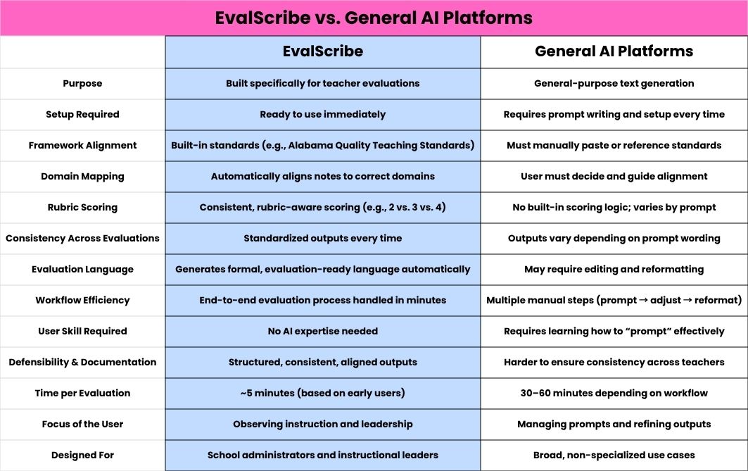 Disclaimer: EvalScribe™ is a patent pending independent educational technology tool and is not affiliated with, endorsed by, or sponsored by the Department of Education or any government entity. References to specific state frameworks (e.g., TKES) are for informational compatibility purposes only. This application is an AI-assisted drafting tool; all final evaluation content, scoring accuracy, and resulting employment decisions are the sole responsibility of the administrator.